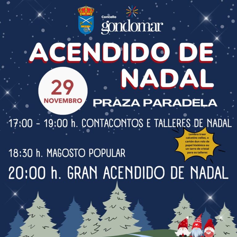 O sábado 29 de novembro, Gondomar acenderá o seu Nadal ás 20:00 horas na Praza Paralela. Durante a tarde, haberá contacontos e talleres de Nadal.