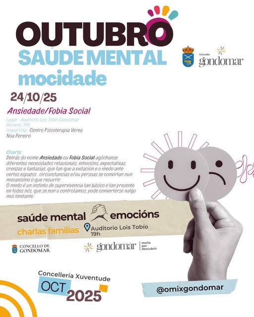 CHARLA : Ansiedade, fobia social 📅 24 de OUTUBRO 🕔 19:00 h 📍 Auditorio Lois Tobío Praza limitada! Inscricións no 986 369 746. + Engadir a Google Calendar + Engadir a iCal ou Outlook 00 días 00 horas 00 minutos 00 segundos Data Out 24 2025 Hora 19:00 Categoría Charlas Compartir evento
