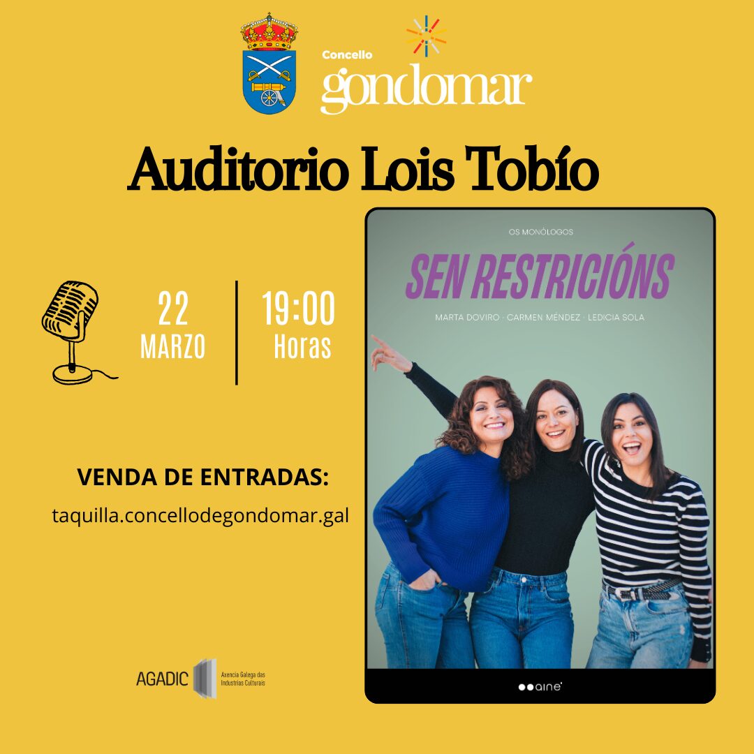 SEN RESTRICIÓNS Espectáculo de humor: SEN RESTRICIÓNS , con Marta Doviro, Carmen Méndez e Ledicia Sola Auditorio Municipal Lois Tobío 19:00 h. Entradas dispoñibles na TAQUILLA DO CONCELLO + Engadir a Google Calendar + Engadir a iCal ou Outlook 00 días 00 horas 00 minutos 00 segundos Data Mar 22 2026 Hora 19:00 Etiquetas Teatro Categoría Teatro Compartir evento